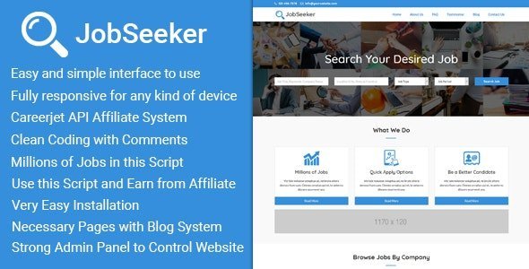 JobSeeker is a responsive PHP Script for job searching, featuring an appealing front end and comprehensive backend functionalities. Its admin panel enables non-programmers to handle various tasks effortlessly. The script utilizes the Careerjet API for job searches, tapping into millions of listings across different categories on the Careerjet website. By using this script, you eliminate the need for manual job posting or employer management, allowing visitors to instantly find their desired jobs.